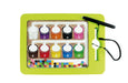 Auf der anderen Seite ist ein farbenfrohes Sortierspiel integriert. Bunte Kugeln müssen in die jeweils passenden farbigen Töpfe sortiert werden.